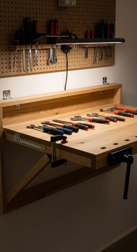 A folding workbench gives you workspace without permanently stealing floor room. When folded up, it sits flat against the wall. Drop it down for projects. Wall-mounted kits cost $50–$100 or you can build one from a solid-core door slab and piano hinge for less. Add a lip to prevent tools from rolling off. Mount a power strip above it for easy access. Ideal for smaller garages where a full-time bench would block the car.