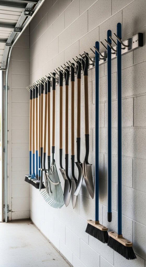 Rakes, shovels, and brooms create instant chaos when they lean in a corner. A wall-mounted garden tool rail with rubberized hooks solves this for around $25–40. Mount at shoulder height. Each tool hangs vertically, taking up almost no horizontal space. Some systems clamp tools automatically — no hooks to attach individually. This keeps handles off the floor, where they become tripping hazards. Add a small shelf below the rail for pots, gloves, or fertilizer bags.