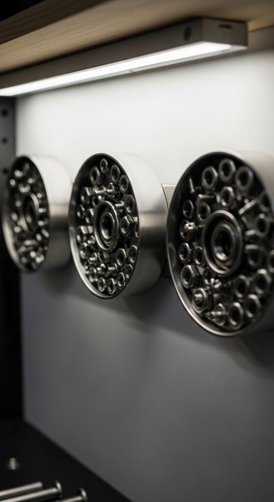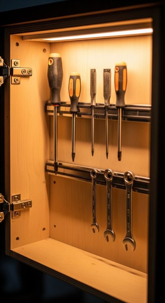 Magnetic strips are usually used in kitchens, but they’re excellent in garages too. Mount them inside cabinet doors to hold small metal tools — screwdrivers, chisels, pliers, drill bits. This uses dead space that would otherwise sit empty. A 24-inch magnetic strip costs under $15. Use two screws to mount it securely. Inside the door, tools stay protected from dust while remaining completely accessible. It’s a subtle upgrade with a big daily convenience payoff.