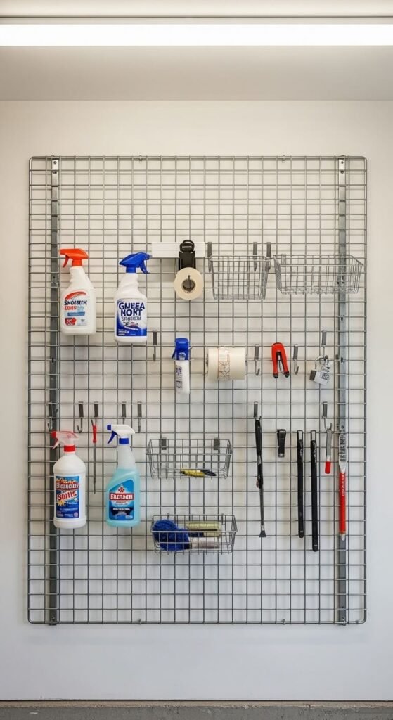 Wire grid panels — often sold as retail display fixtures — are cheap, flexible, and strong. A 2×4-foot panel costs $20–30. Mount to studs. Then use S-hooks, wire bins, and small shelves that clip directly onto the grid. Rearrange whenever your storage needs change. These work well for cleaning supplies, small tools, spray bottles, and rolled items. Unlike pegboard, there’s no hole-drilling required for hooks. Great for renters or anyone who wants a less permanent solution.