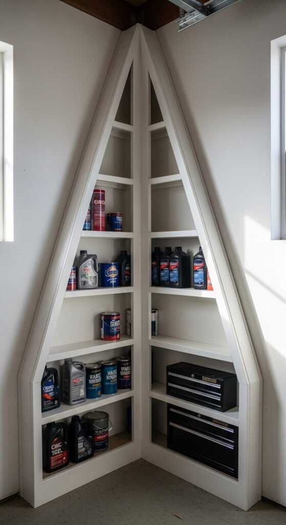 Garage corners are almost always wasted. A simple corner shelf unit fills that triangle of space and adds meaningful storage. Build it from plywood and 2×4 supports. Paint it to match the walls. Three or four shelves from floor to ceiling create real capacity — enough for paint cans, automotive supplies, and spare parts. The build takes a half-day and materials cost under $50. If carpentry isn’t your thing, L-shaped corner shelves sold at hardware stores achieve a similar result.