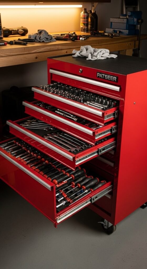 A rolling tool cart doesn’t just store tools — it keeps your workflow mobile. Pull it to wherever you’re working. Entry-level 5-drawer carts run $80–150 and hold a full set of hand tools with room to spare. Use drawer liners to keep tools from sliding. Label each drawer by category: sockets, wrenches, screwdrivers, measuring tools. A cart with a solid top lid also doubles as a small work surface. Roll it against the wall when done so it doesn’t occupy center floor space.