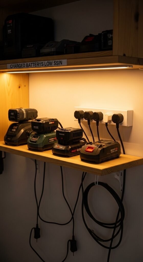 Power tool batteries left scattered across the workbench drain faster and get damaged. A dedicated charging station shelf keeps chargers plugged in, batteries topped up, and everything in one spot. Build a simple plywood shelf, mount it at eye level, and add a power strip below it. Chargers plug into the strip. Charged batteries sit on the shelf. Label each charger position. This takes about an hour to build and costs $20–30. No more hunting for a charger before starting a project.