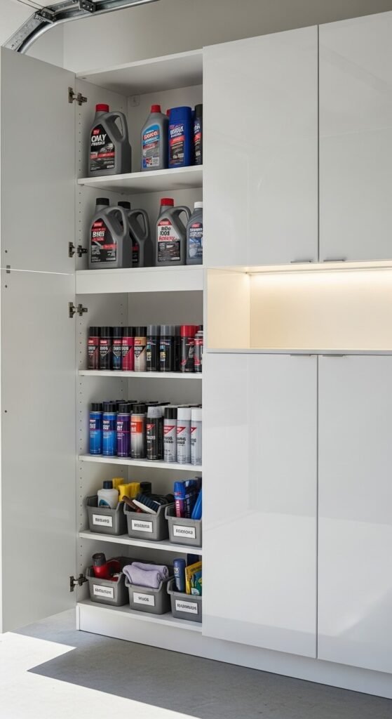 Exposed shelving looks organized until it doesn’t. Wall-mounted cabinets with doors hide the clutter behind a clean front, making the whole garage feel tidier. Ready-to-assemble garage cabinets start around $80–150 per unit. Mount a row of uppers on one wall for chemicals, paints, and supplies you don’t want kids accessing. Add child safety locks. Inside, use bins and shelf risers to maximize the cabinet’s interior. Closed storage makes the entire garage look more intentional.
