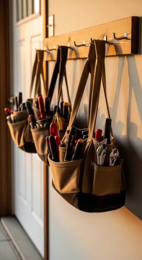 Keep frequently used tools near the garage door entry where you actually grab them. A simple wooden rail — even a thick dowel mounted on two brackets — lets you hang tool bags, tote bags, and kits by their handles. Mount it at chest height. Grab what you need without digging through cabinets. This is a two-hour DIY project using a $5 dowel and $10 in hardware. Use one bag per task category: plumbing, electrical, painting, general repair.