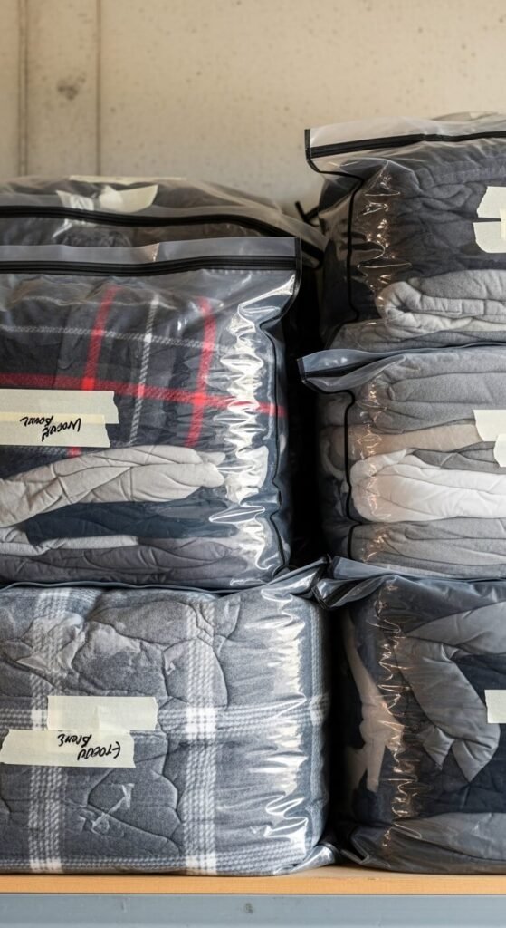 Bulky seasonal items like winter coats, sleeping bags, and blankets consume enormous bin space. Vacuum compression bags shrink them down to a fraction of their size. A pack of 6 bags costs $15–25. Stuff them, zip them, and use a vacuum to compress. Store flat on a shelf or slide under a workbench. Label each bag with a strip of masking tape and a marker. They protect from moisture and pests too. When the season changes, swap the bags out. Excellent use of shelf space.
