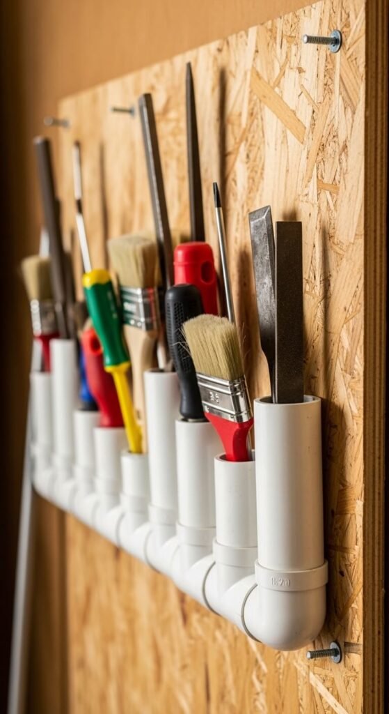 PVC pipe is cheap, easy to cut, and completely customizable. Buy a 10-foot length of 2–3 inch diameter PVC for under $10. Cut sections into varying lengths. Mount them upright or at an angle on a plywood backer board. Each section holds one tool upright by the handle — perfect for screwdrivers, chisels, paintbrushes, and files. This is a beginner-level DIY project. No special tools beyond a hacksaw. The whole organizer costs under $20 to build.