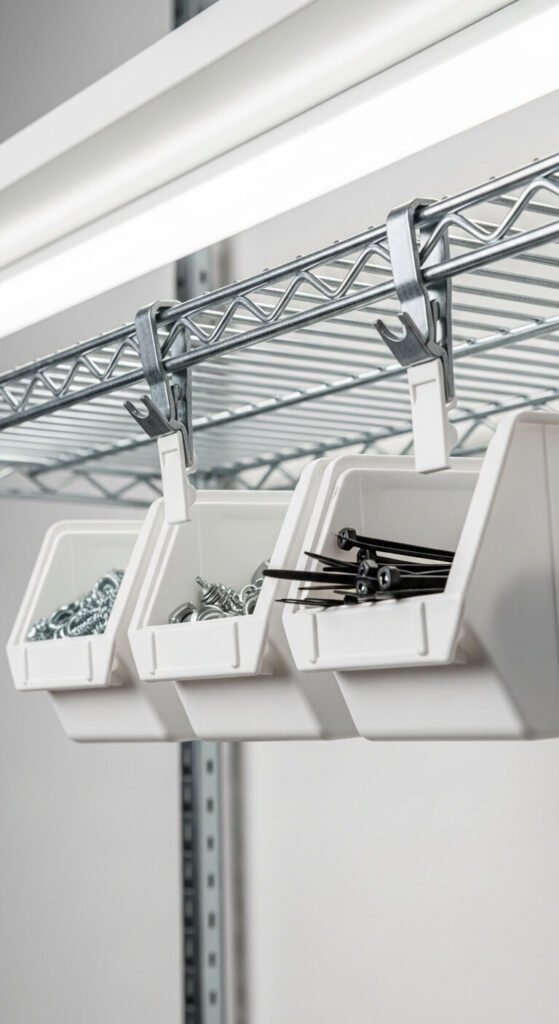 The space directly under a shelf is almost always unused. Clip-on under-shelf bins attach to wire shelving with no tools and hang down, creating an extra row of storage without taking up shelf surface. Packs of 4–6 bins cost $15–25. Use them for small hardware, rubber bands, batteries, tape rolls, and zip ties. They work on any wire shelving and take 30 seconds to install. A small but smart upgrade that multiplies the usable storage on every shelf.
