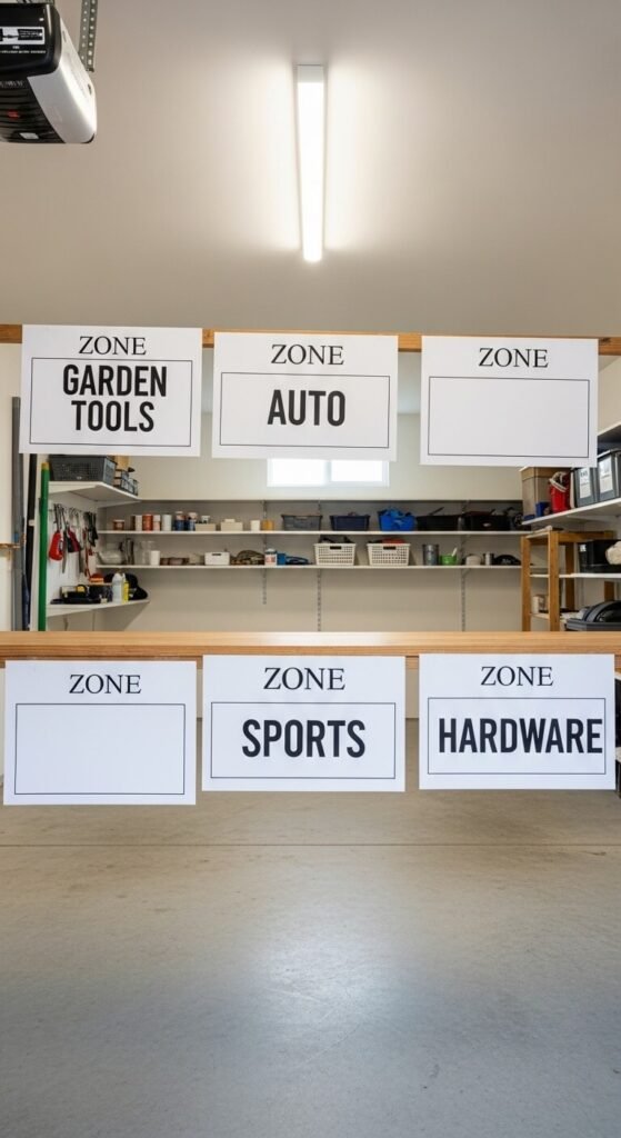A garage can be perfectly organized and still feel chaotic if nothing is labeled. Zone labels mounted at eye height train every household member where things belong — and where to return them. Print labels on a home printer, laminate them, and mount with Command strips. Label shelf edges, bin fronts, and wall zones. Use large, readable font. A label maker speeds this up but isn’t required. This step takes one afternoon and costs almost nothing. It’s also the reason your organization system actually holds up over weeks and months.