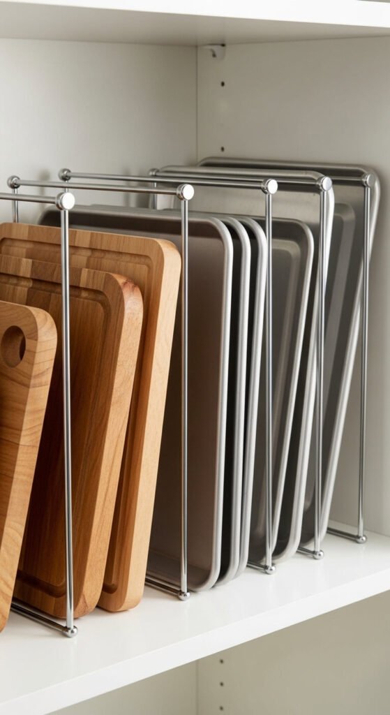 Tension rods aren’t just for curtains. Installed vertically on shelves, they create dividers that keep cutting boards, baking sheets, and pan lids standing upright instead of stacked in a messy pile. You can find tension rods for under $3 each. No tools needed. Adjust and reposition anytime. It’s a flexible, damage-free way to add structure to awkward shelf space.