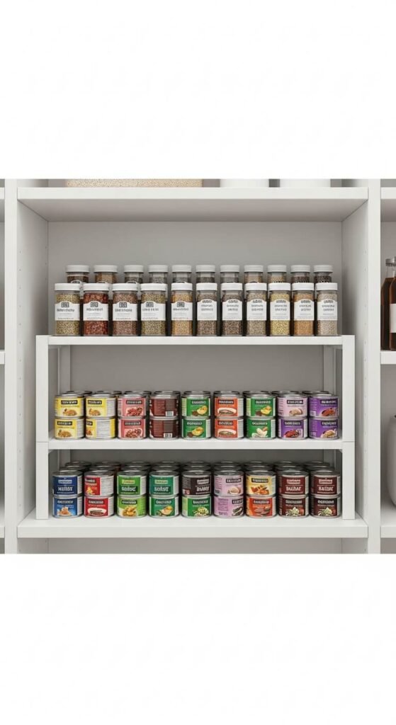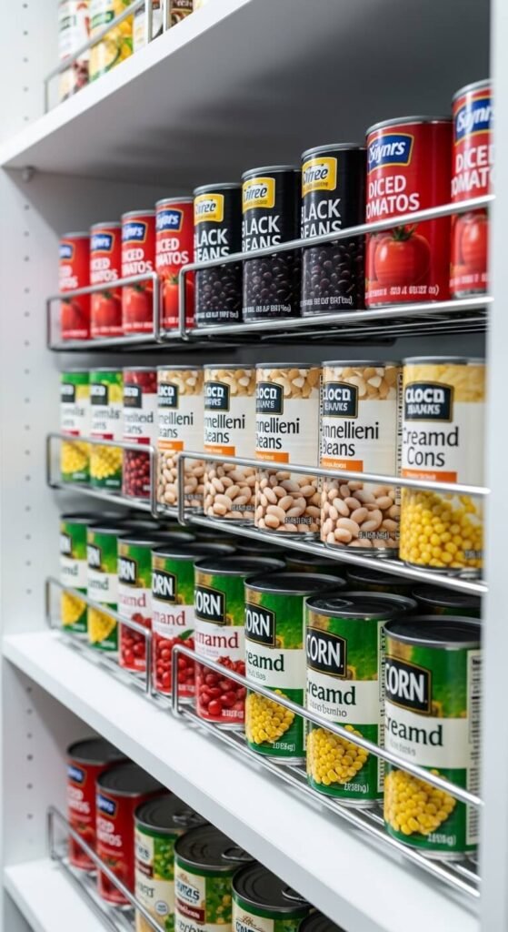 Cans stacked on top of each other are annoying and unstable. Stackable can organizers create a rolling display where the oldest cans move to the front. This is called first-in, first-out—the same method grocery stores use. You can find stackable can racks online for $10–$20. They make a huge difference on deep shelves where cans otherwise pile up in chaotic towers.