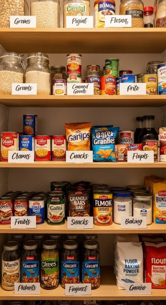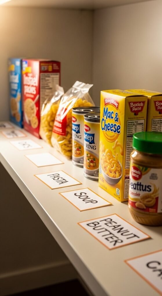Labels on containers are great. Labels on the shelves themselves are even better. When a shelf has a designated zone marked—Grains, Baking, Canned Goods, Snacks—things go back where they belong even after a chaotic week. Use adhesive label strips, masking tape, or small printed cards slid into a rail. This system works especially well for households with multiple people using the same pantry.