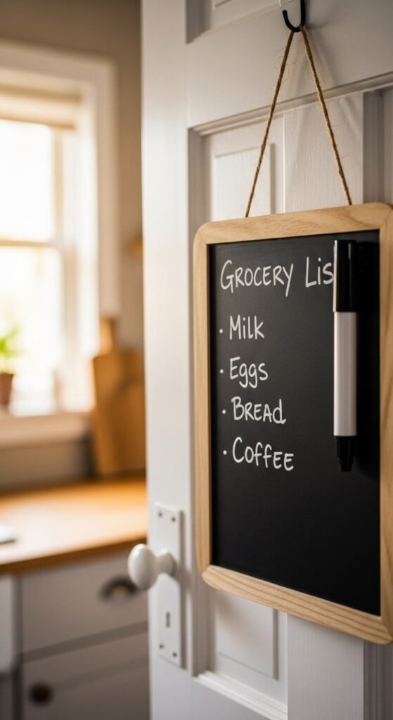 The moment you finish something, write it down. A small whiteboard or chalkboard on the pantry door makes this effortless. Everyone in the household can add to it. You’ll stop buying duplicates and stop forgetting essentials. Magnetic whiteboards are cheap and easy to stick inside the door. Or simply tape a notepad there and replace pages weekly. Simple, old-school, and genuinely effective.