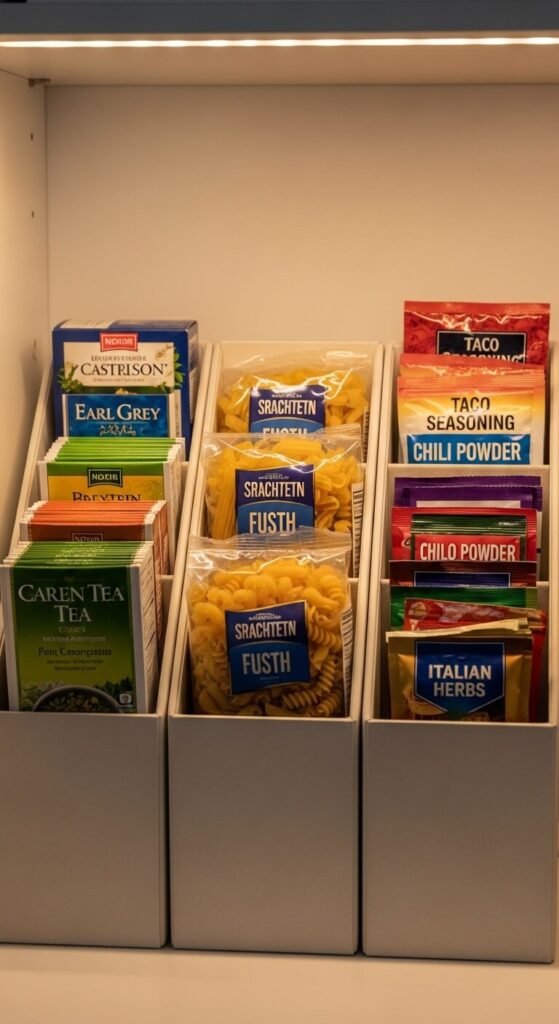 Boxes of pasta, tea bags, and seasoning packets never stand up right. They fall, they spill, and they make shelves look messy. Vertical magazine file holders fix this immediately. Stand boxes upright inside the files like books on a shelf. You can see and reach each item instantly. These are often under $2 each at dollar stores and can be labeled for different categories.