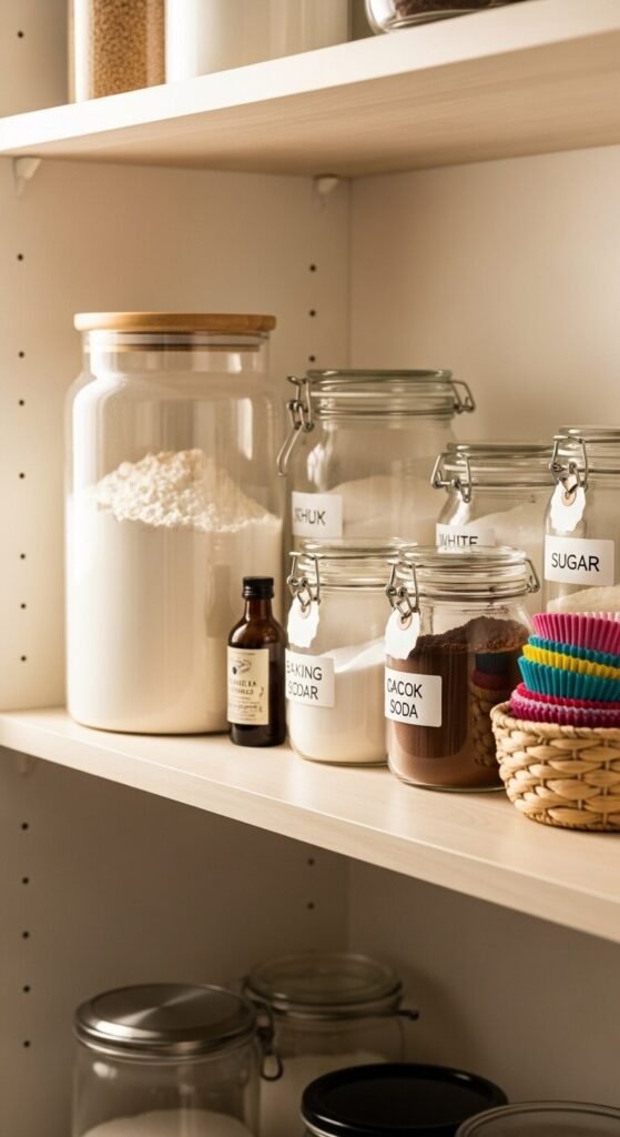 Group all your baking supplies together in one place. Flour, sugar, baking powder, vanilla, chocolate chips—all of it lives in one zone. When you’re ready to bake, you pull from one spot instead of searching three shelves. Use a tray or small bin to corral smaller items like sprinkles and liners. This setup is especially helpful around the holidays when baking frequency spikes.