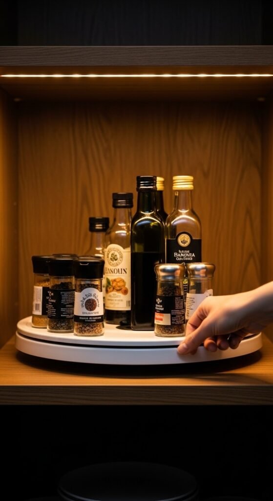 Deep shelves are where things go to die. That hot sauce from 2019? It’s back there somewhere. A lazy Susan turntable fixes this instantly. Spin it to reach anything without digging. They cost around $5–$15 at most home stores. Use one for oils and vinegars, another for canned goods, and a smaller one for spice jars. No more forgotten items hiding at the back of the shelf.
