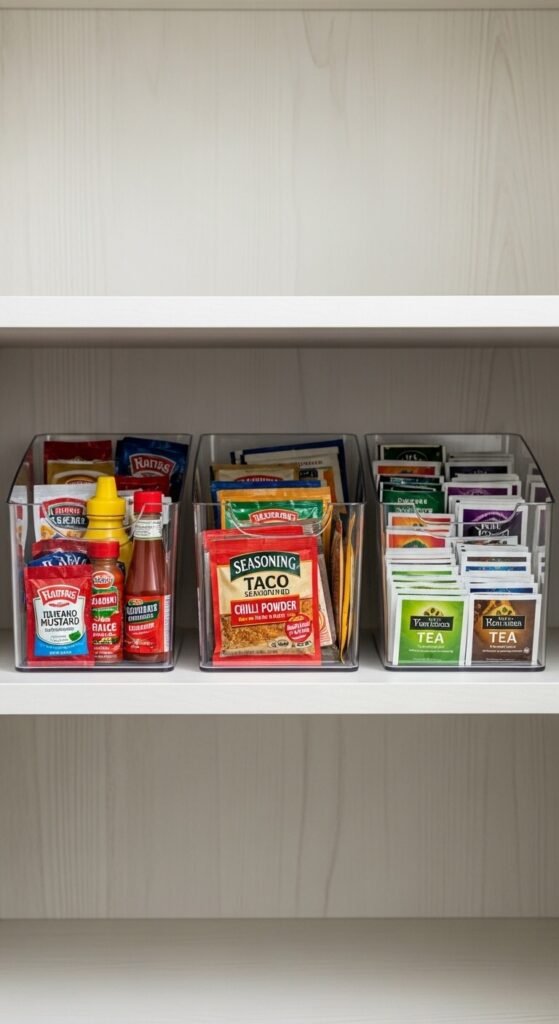 Sauce packets, seasoning envelopes, and tea bags are the hardest pantry items to contain. They slide, they scatter, they disappear. Clear plastic shoe boxes (often $1–$2 each) are perfect for corralling them. Sort by category—Asian sauces in one, taco seasonings in another, sweetener packets in a third. Snap the lid on and stack them. Problem solved, clutter gone.