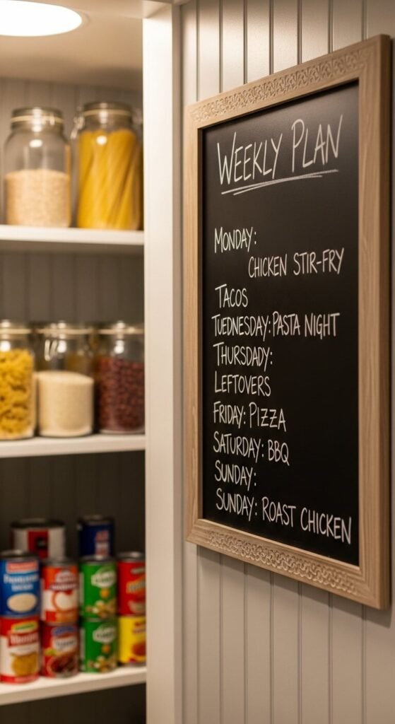 Use a small chalkboard to write your weekly meal plan right inside the pantry. Seeing Tuesday’s dinner is “lentil soup” reminds you to prep ahead and pull the right ingredients. You’ll cook with more intention and waste less. A chalkboard paint square on the wall costs almost nothing if you’re up for a DIY weekend project. Or stick up a small framed board—same result, no painting needed.