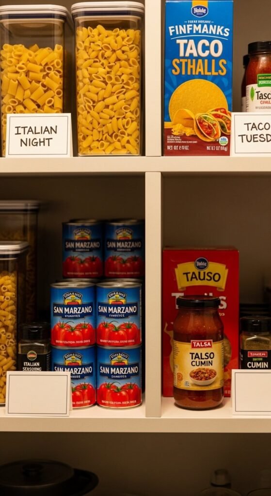 Instead of grouping by food type, try grouping by meal. Put all your pasta night supplies together—pasta, canned tomatoes, olive oil, parmesan. Keep taco supplies in one basket. Stir-fry ingredients in another. When it’s time to cook, you grab one zone instead of hunting across five shelves. This approach is especially helpful for busy weeknights when you need to move fast and think slow.