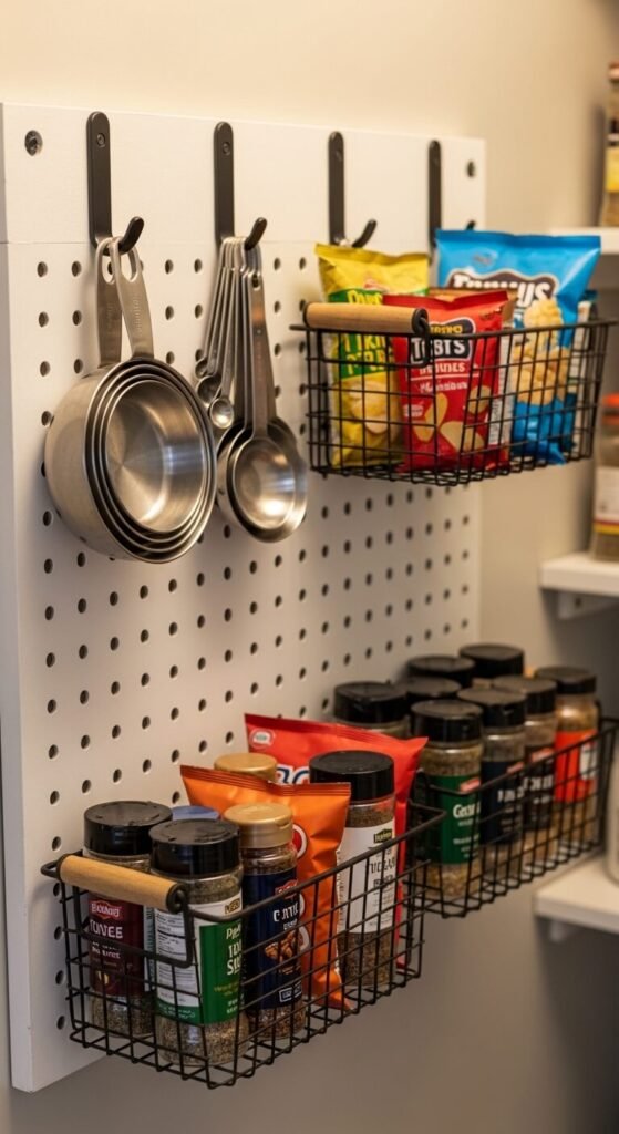 If you have any open wall space inside or near your pantry, a pegboard panel turns it into serious storage. Hang hooks for measuring cups and spoons, add small baskets for snacks, and clip on bins for spice packets. Pegboards are inexpensive, fully customizable, and can be rearranged anytime. Paint it to match your space and it looks intentional, not makeshift.