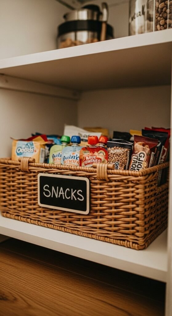 Put approved snacks where kids can actually reach them. A dedicated snack basket at child height means fewer interruptions while you cook and more independence for them. Use a basket or bin that’s easy to grab and put back. Fill it at the start of the week so kids know exactly what’s available. Bonus: it teaches portion awareness without a single lecture.