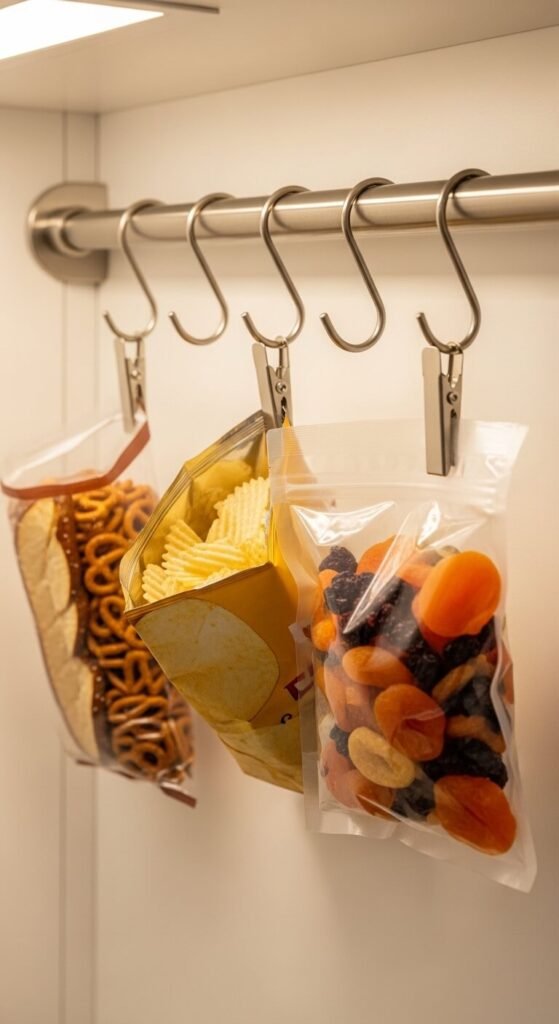 Open bags of chips, pretzels, and dried fruit take up disproportionate shelf space and go stale fast. Binder clips and S-hooks let you hang them off a rail or shelf edge instead. Clip the bag shut, hook it up, and reclaim that shelf space. Install a simple metal rail (like a towel bar) on the wall or inside a cabinet door for a clean, low-cost hanging system.