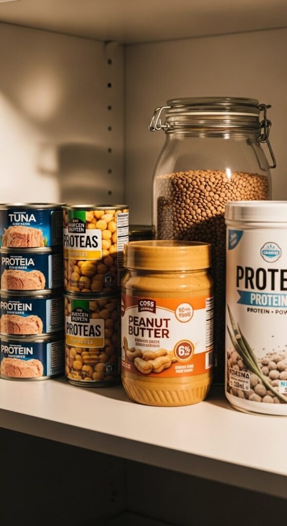Group all your protein staples in one place. Canned fish, nut butters, dried lentils, beans, canned chickpeas—put them together. When you’re building a quick meal, you go straight to the protein zone and make a choice without scanning the whole pantry. This also helps you spot when you’re running low on a category so you can restock intentionally.