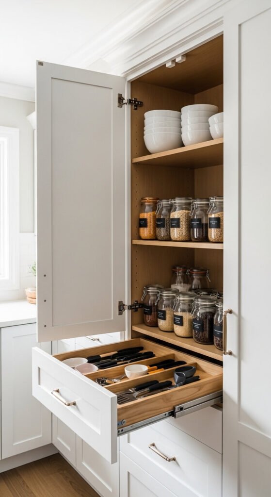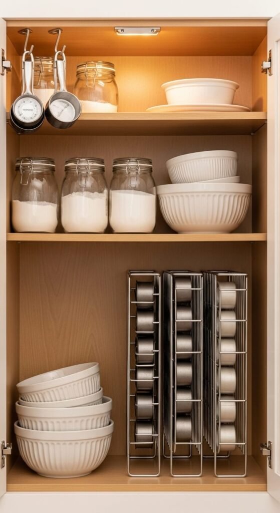 Mixing baking supplies across multiple cabinets makes the whole process slower. Give all your baking supplies one home — flour, sugar, baking soda, vanilla, measuring tools, and pans. When everything is together, you set up faster and clean up faster. Use the interior door for hanging measuring cups and the main shelf for dry goods in labeled jars. Baking pans go vertical in a rack at the bottom or side.