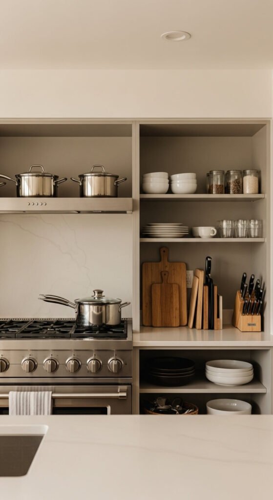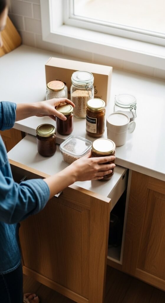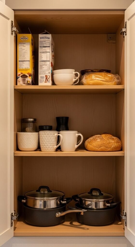 Group cabinet contents by what you actually do in each area. Keep pots near the stove, prep tools near the counter, and baking supplies in one dedicated zone. Stop mixing unrelated items on the same shelf. When everything lives near where it gets used, cooking becomes faster and less frustrating. This is the single most impactful change you can make before buying any organizer. Walk through your cooking routine once and rethink the layout based on real habits.