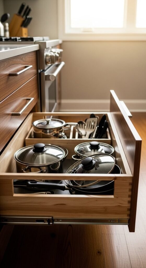 Deep lower cabinets are notoriously hard to use. Things get shoved to the back and forgotten. Pull-out cabinet drawers fix this by bringing everything to you. Slide the drawer out and see everything at once — no crouching, no digging. You can buy slide-out shelves online for $30–$60 and install them yourself with basic tools. Look for ones with soft-close glides. They work especially well for pots, pans, and small appliances.
