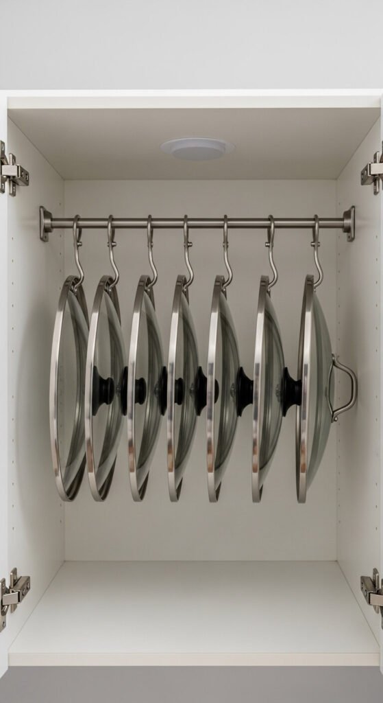 Pot lids are a storage nightmare. They slide around, fall over, and take up way too much room. A simple tension rod mounted horizontally inside a cabinet holds lids upright like files in a drawer. It costs almost nothing — tension rods run $3–$8. No drilling required. Adjust the rod to fit your cabinet width and slide lids in vertically. This clears shelf space for the actual pots and keeps lids visible and accessible.