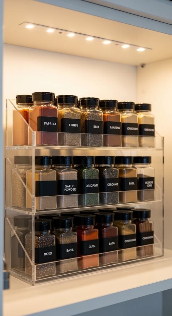 Digging through a flat pile of spice jars to find cumin is one of the most common kitchen frustrations. A tiered spice rack lifts the back rows so every jar is visible at once. Bamboo and acrylic versions cost $12–$25 and fit most standard cabinets. Arrange spices alphabetically or by cuisine — whatever matches how you actually cook. Uniform jars look cleaner and fit better, but even keeping your existing jars in a rack makes a huge difference.