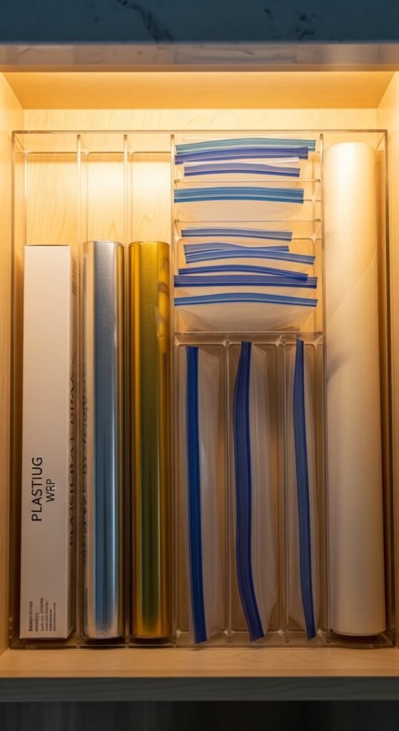 Plastic wrap, foil, zip bags, and parchment paper tend to get thrown into random drawers and cabinets. Give them one dedicated home — ideally a shallow drawer near your prep area. Use a drawer divider or simple bins to keep each type separated. Everything stays flat, rolls stay in place, and you stop tearing apart drawers looking for the right size bag. This single-purpose drawer takes five minutes to set up and saves real time every day.