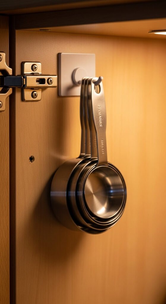Measuring cups and spoons disappear into drawers and come out tangled. Hanging them on the inside of a cabinet door keeps them visible and within reach. Use adhesive hook strips — no drilling needed. Command hooks from any hardware store cost about $5 for a pack. Hang cups by their handles in graduated size order. It takes under three minutes and immediately clears drawer space for other tools.