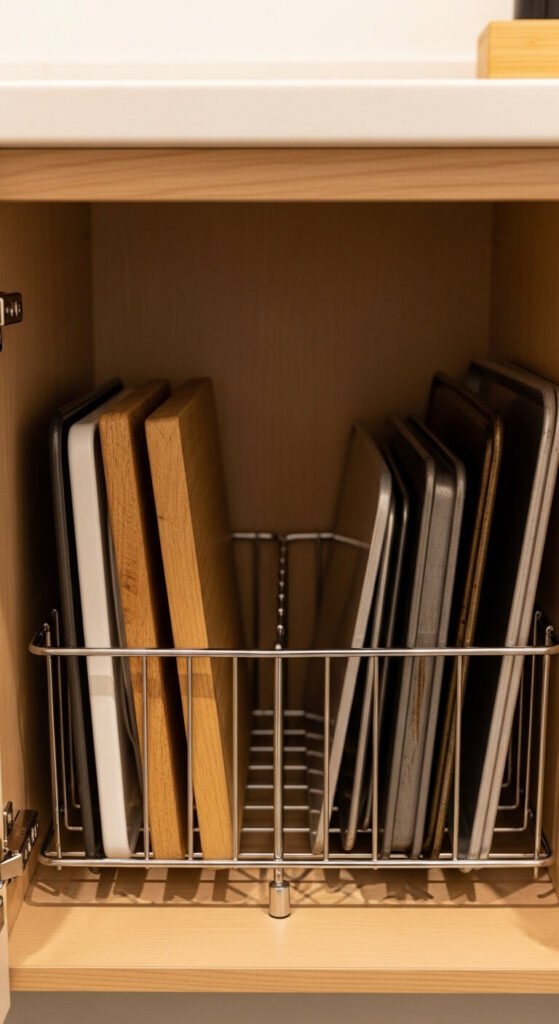 Stacking baking sheets flat means pulling out the whole pile every time you need the one on the bottom. Store them vertically like books using a wire rack divider. These dividers cost $8–$15 at kitchen stores or online and fit most lower cabinets. Stand sheets, cutting boards, and baking pans upright and pull out only what you need. It is faster, less frustrating, and actually protects the surfaces from scratching.