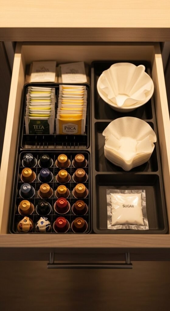 If coffee and tea supplies live across three different cabinets and two drawers, mornings become a treasure hunt. Designate one small drawer for everything hot-drink related — pods, tea bags, filters, sugar packets, and a small spoon. Use a simple drawer tray with compartments, or DIY one with small boxes lined up inside. This takes ten minutes to set up and makes every morning noticeably smoother.