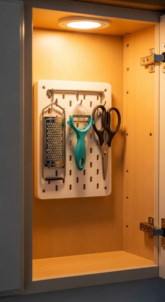 The inside surface of cabinet doors is almost always wasted space. A small pegboard panel mounted to the interior gives you a hanging wall for lightweight tools. Use removable adhesive mounts or screws to attach a thin piece of pegboard cut to fit. Add metal hooks and hang peelers, graters, small scissors, or even spice packets. This DIY project costs under $15 in materials and opens up significant drawer and shelf space.