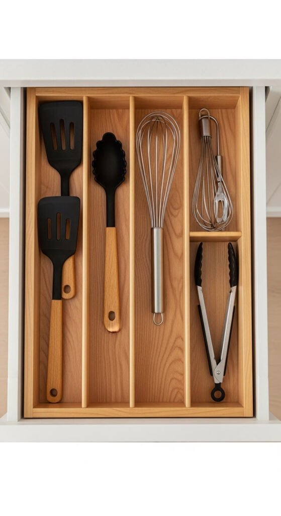 The classic junk drawer full of tangled spatulas and mystery tools is fixable with expandable drawer dividers. Bamboo versions cost $10–$20 and adjust to fit almost any drawer width. Group tools by type: flipping, stirring, cutting. If you have more than fits neatly, that is a sign to remove tools you rarely use. A clean utensil drawer means faster cooking because you are not fishing around for the right tool every time.