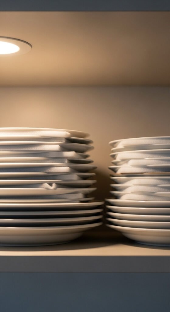 Stacking plates without protection causes chips and scratches over time — especially with heavier ceramic and stoneware. Thin foam plate protectors or felt pads sit between each plate and prevent surface damage. A pack of 20–30 costs under $10. They also make unstacking quieter, which matters in households with early risers or light sleepers. Stack confidently and keep your dishes lasting longer without buying anything fancy.