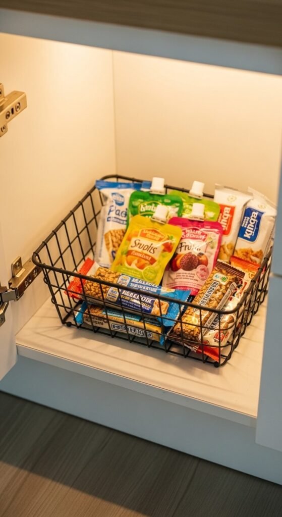 Put kid-friendly snacks in one low, accessible basket so children can help themselves without opening every cabinet. Use a simple wire or wicker basket on a lower shelf. Keep only approved snack options in there. It teaches kids independence and stops the cycle of “I can’t find anything to eat” followed by cabinet doors hanging open. Refill the basket weekly and move sweets or off-limit snacks to higher shelves.