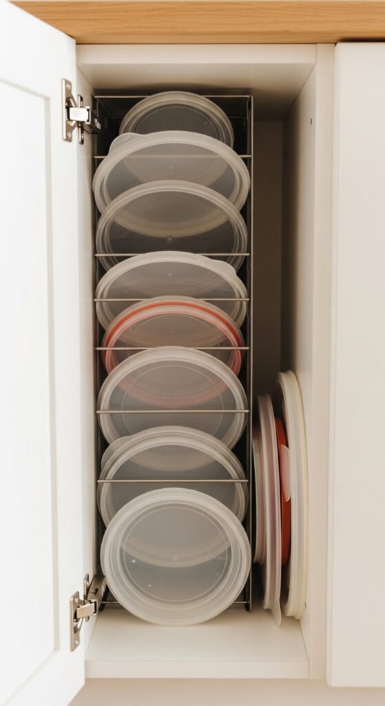 Mismatched plastic container lids are a universal kitchen frustration. Dedicate one small section or bin just for lids, sorted by size. A narrow vertical file rack works perfectly — stand lids upright and flip through them like records. Toss lids without matching containers and containers without lids. Once the collection is paired down to what actually matches, find a system and stick to it. This takes 20 minutes once and saves ongoing daily frustration.