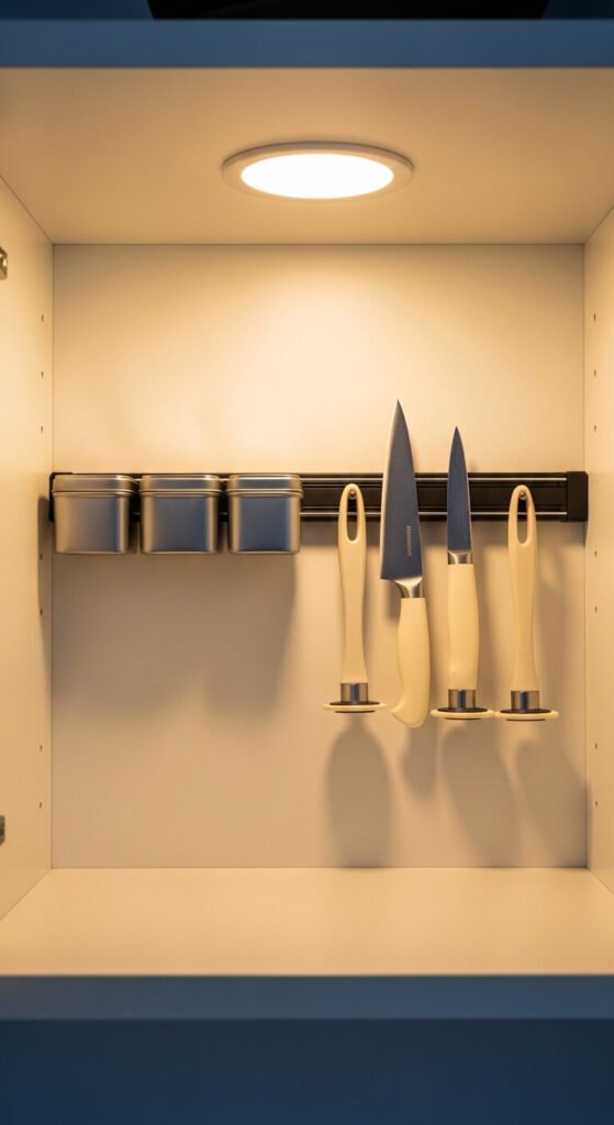 Magnetic strips are not just for knife blocks on the counter. Mount one inside a cabinet back wall to hold metal spice tins, small tools, or even a bottle opener. Adhesive-backed magnetic strips are inexpensive and require no tools to install. Pair with magnetic spice containers for a system that keeps your shelf completely clear. This works well in narrow cabinets where shelves are already crowded.