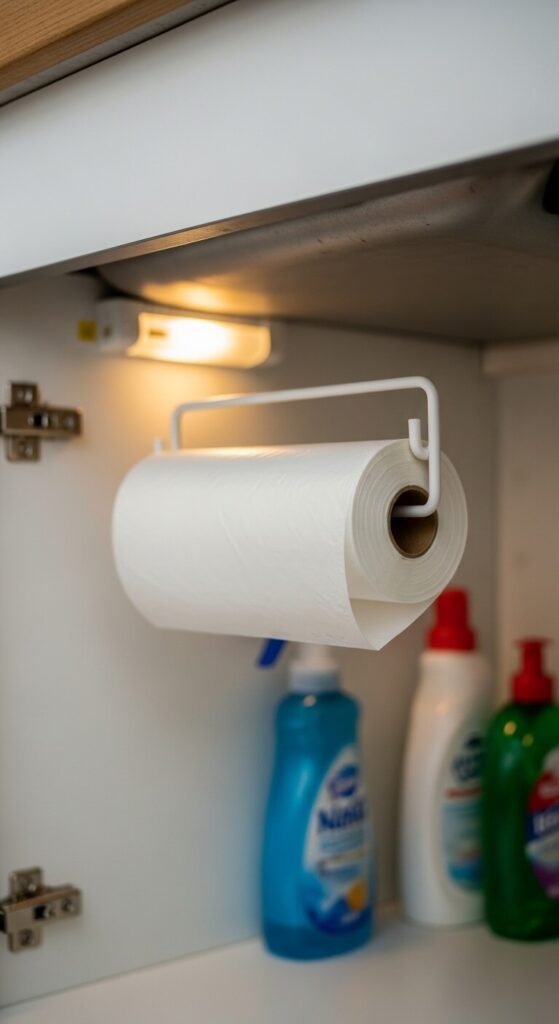 Trash bags stuffed into a random drawer or shoved under the sink never come out cleanly. Mount a simple bag roll holder inside your under-sink cabinet or any lower cabinet door. These cost just a few dollars and mount with screws or adhesive. Pull a bag off the roll with one hand. This sounds minor but removing friction from small daily tasks adds up to a noticeably smoother kitchen routine.