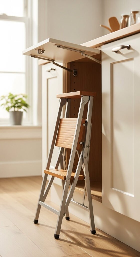 High cabinets often become dead storage zones because reaching them is inconvenient. A slim folding step stool stored inside a cabinet or hung on a wall hook changes this. Use high cabinets for seasonal or rarely used items — holiday serving dishes, specialty gadgets, extra stock. When your step stool is easy to grab, those upper shelves become genuinely useful instead of wasted. Look for a two-step folding version that stores flat for around $20–$35.