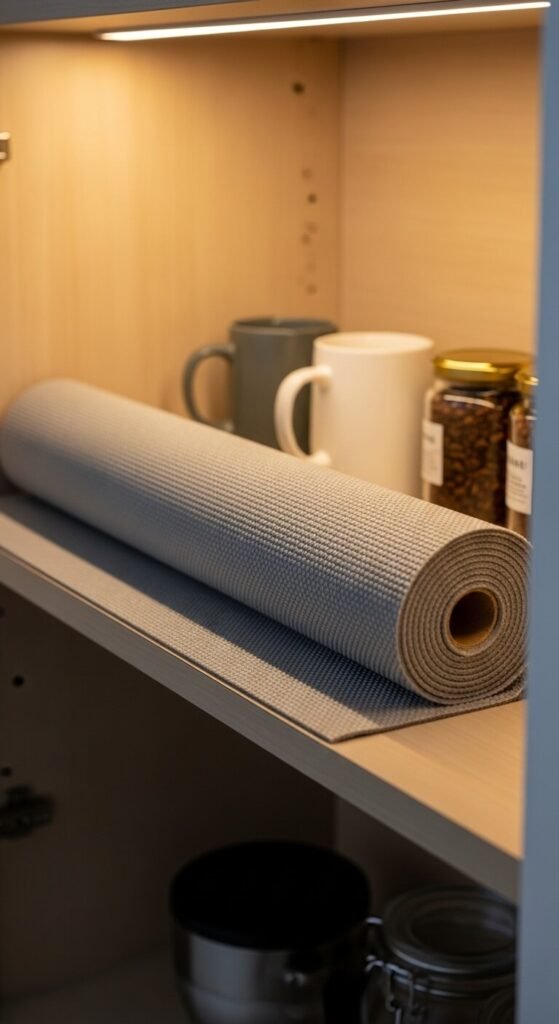 Dishes sliding around, jars tipping over, and shelves getting scratched — non-slip shelf liners solve all three. They cost $5–$12 for a roll that covers multiple shelves. Cut to fit with scissors — no measuring required. The liner grips both the shelf and whatever sits on it. Cabinets stay cleaner longer too, since the liner catches crumbs and spills instead of the wood. Wash or replace as needed.