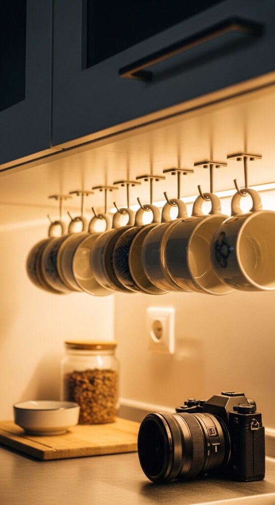 Cabinet shelf space is often used to store mugs that could hang instead. Under-cabinet mug hooks attach to the underside of a shelf and hold mugs by the handle. A pack of 6–8 hooks costs $5–$10. No drilling needed for adhesive versions. Hanging mugs frees up an entire shelf row for other items and also looks intentional and clean. Just confirm your mugs have a handle loop large enough to fit the hook.