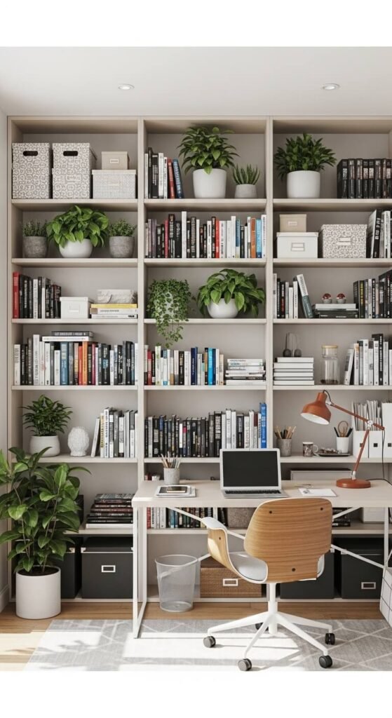 - Stack shelving units floor to ceiling to maximize storage in home offices, living rooms, and bedrooms.