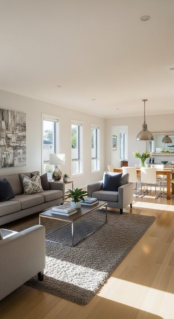 Open-concept rooms look beautiful, but they can feel chaotic without intentional zones. Use furniture placement — not walls — to define each area.