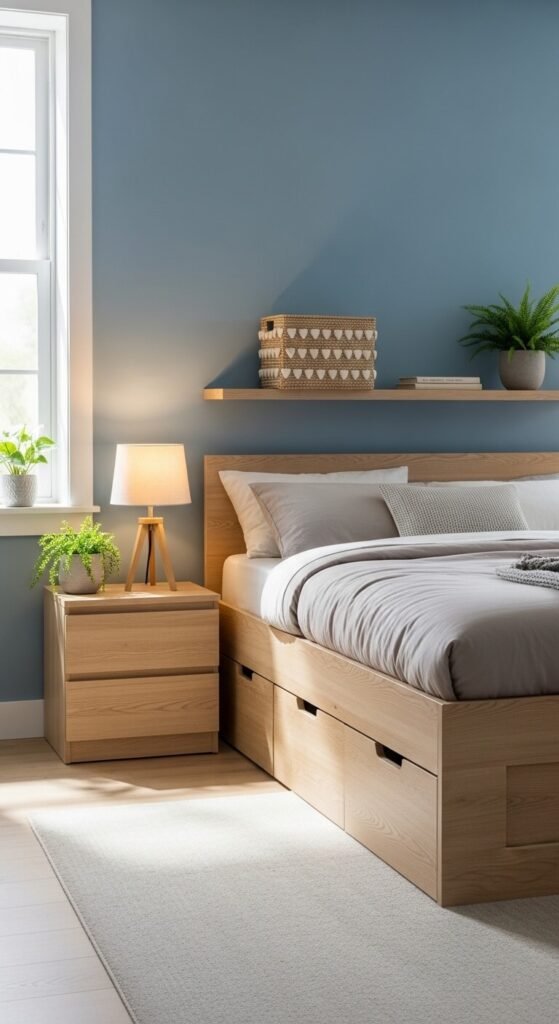 - Bed frames with drawers underneath — a game-changer in small bedrooms.