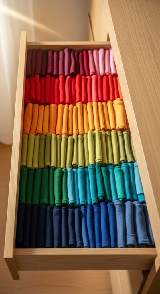 - Declutter first. Folding 50 shirts you never wear is just organized clutter.